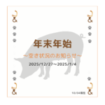 2025年10月5日 / 最終更新日時 : 2025年10月5日 petsitterand ブログ 年末年始空き状況🐽 25年26年、年末年始の空き状況になります✨✨ 早速ご予約入ってきております🙏 日程決まった方はお早めにご連絡お願いいたします〜 ○:ご予約可能 ✖️ […]