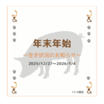 2025年11月3日 / 最終更新日時 : 2025年11月20日 petsitterand ブログ 年末年始空き状況更新しました✨ 2025年度の年末年始の空き状況更新いたしました!(11/3現在) こちらは動物取扱責任者、渡邉の空き状況になります。 . スタッフによる対応はまだまだ可能なのでよろしければお問い合わせお待ちしております! 詳しくはこち […]